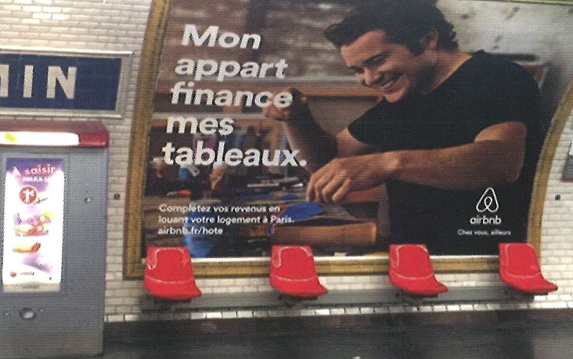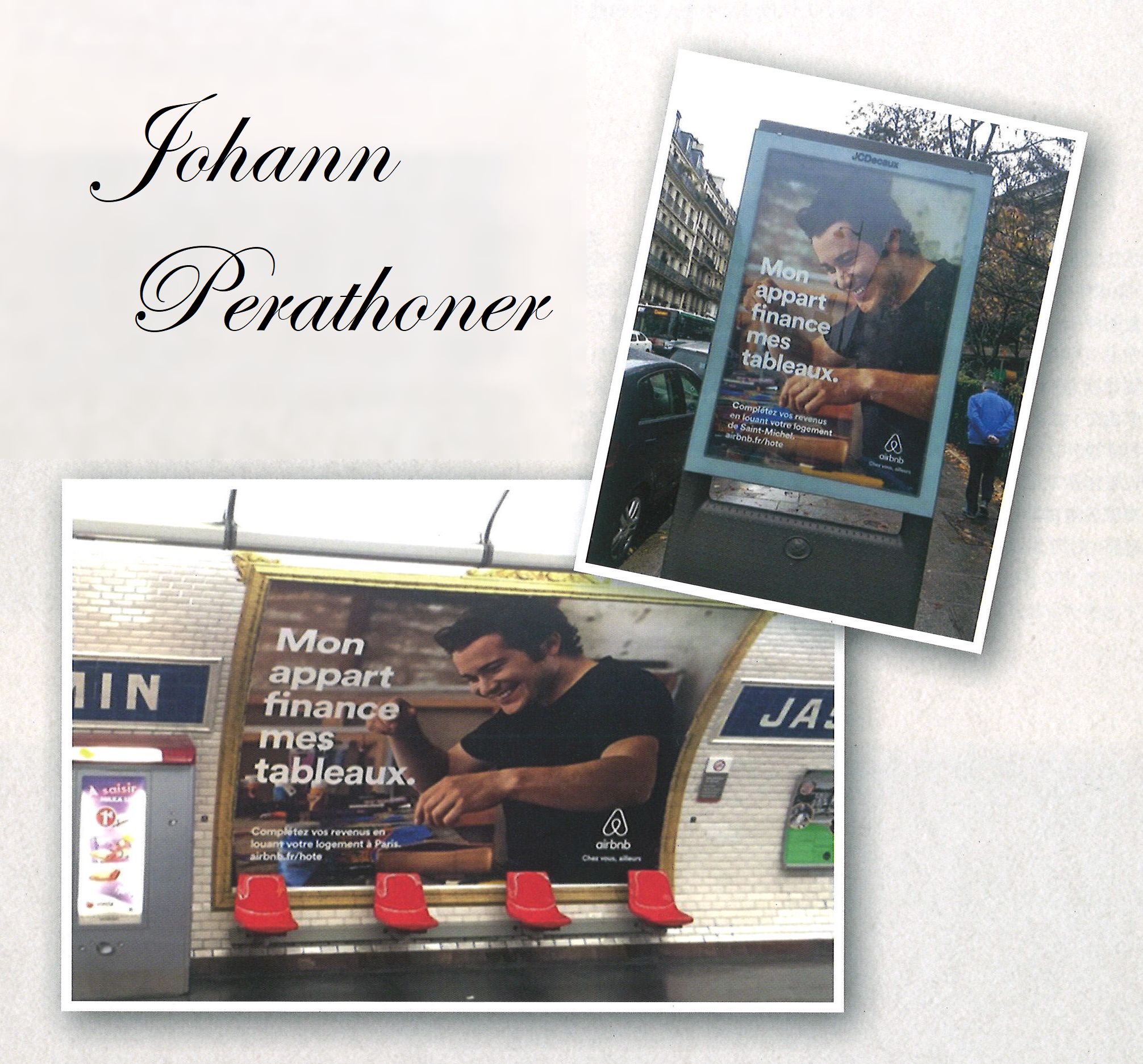 広告はairbnb(エアビーアンドビー)というアメリカで生まれた、旅行者などに民泊を仲介する会社のもの。ヨハン・ペラトーネル画伯が芸術分野の関係者へのある大きな物件の販売に携わり、その関係者がairbnbにヨハン画伯を紹介し、広告出演の依頼を持ちかけたことがきっかけとなり、アトリエ作品を制作する笑顔の画伯が大きく登場することとなりました。